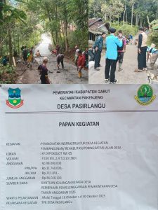 “Seperti yang terlihat pada gambar,papan informasi proyek telah terpasang dengan jelas, memberikan detail lengkap mengenai pekerjaan ini. Rabat beton ini dibangun dengan volume sepanjang 150 meter, lebar 2,4 meter,dan tebal 0,10 (360)meter.Total Anggaran sebesar Rp 98.000.000 sumber dana bantuan keuangan Kepada desa pembinaan penyelenggaraan pemerintah Desa Tahun Anggaran 2025 yang pelaksanaannya dipercayakan kepada (TPK) Desa Pasirlangu.”