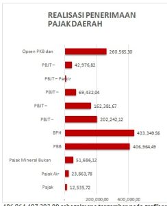 Secara nominal, kontribusi terbesar didapat dari Pajak Bea Perolehan Hak Atas Tanah dan Bangunan (BPHTB) dengan capaian Rp 433.349.568.225,00 dan pada urutan kedua terbesar didapat dari Pajak Bumi dan Bangunan Perdesaan dan Perkotaan (PBB-P2) dengan capaian Rp 406.964.497.293,00 sebagaimana tergambar pada grafik realisasi pajak daerah di atas ini.
