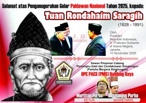 Bandung, Sri-media.com – Tuan Rondahaim Saragih dianugerahi gelar pahlawan nasional oleh Presiden Prabowo Subianto melalui Keputusan Presiden Nomor 116/TK/Tahun 2025. Penganugerahan gelar Pahlawan Nasional ini adalah bentuk penghargaan negara atas jasa-jasa luar biasa para tokoh dalam mencapai, merebut, mempertahankan, dan mengisi kemerdekaan serta mewujudkan persatuan dan kesatuan bangsa Indonesia. Hal itu diumumkan langsung sebelumnya oleh oleh Sekretaris Militer Presiden Mayor Jenderal TNI Kosasih, S.E. di Istana Negara, Jakarta pada momentum Hari Pahlawan 10 November 2025.